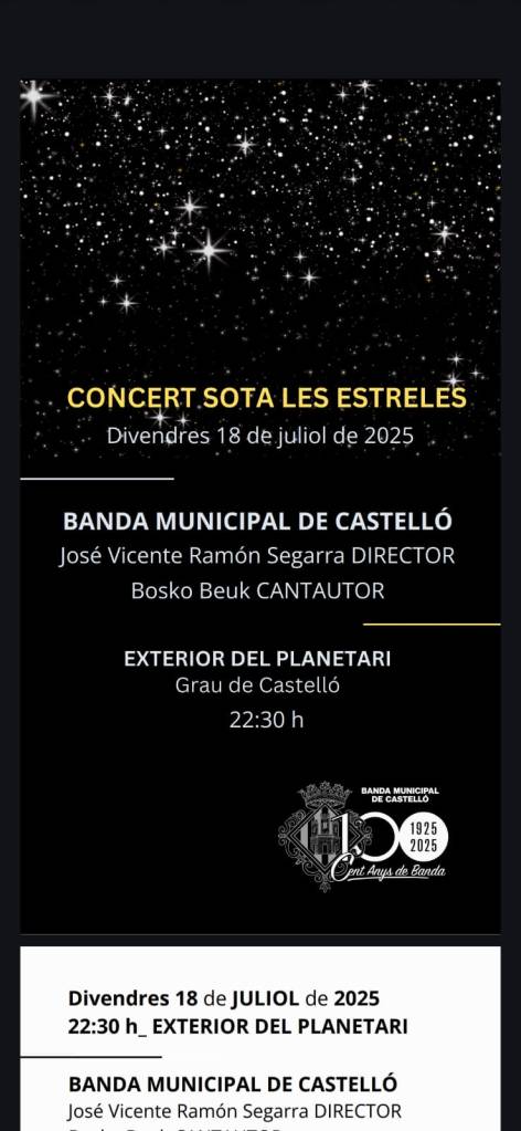 La concejala de Cultura, María España, ha destacado que “el Planetario es el gran centro cultural del verano en Castellón, con más de 60 actividades programadas. Un récord histórico en el que no solo tienen cabida todas aquellas relacionadas con la divulgación científica, sino también otras como los cuentacuentos o este recital. Es una hora estupenda para escuchar buena música junto al mar Mediterráneo y estoy segura que vamos a llenar la explanada del Planetario de Castellón. Va a ser un concierto muy especial de nuestra Banda Municipal, dentro de los actos de su centenario”.