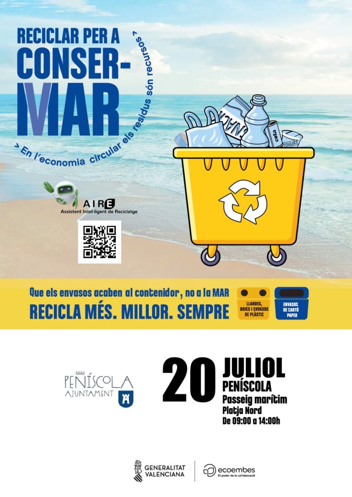 La quinta edición de “Reciclar para ConserMar” llega hoy a Peñíscola. Se trata de la campaña de concienciación del reciclaje en el entorno de las playas que lleva a cabo Ecoembes, la organización que lleva más de 25 años cuidando del medioambiente e impulsando el reciclaje de envases en España, en colaboración con la Conselleria de Medio Ambiente, Agua, Infraestructuras y Territorio.