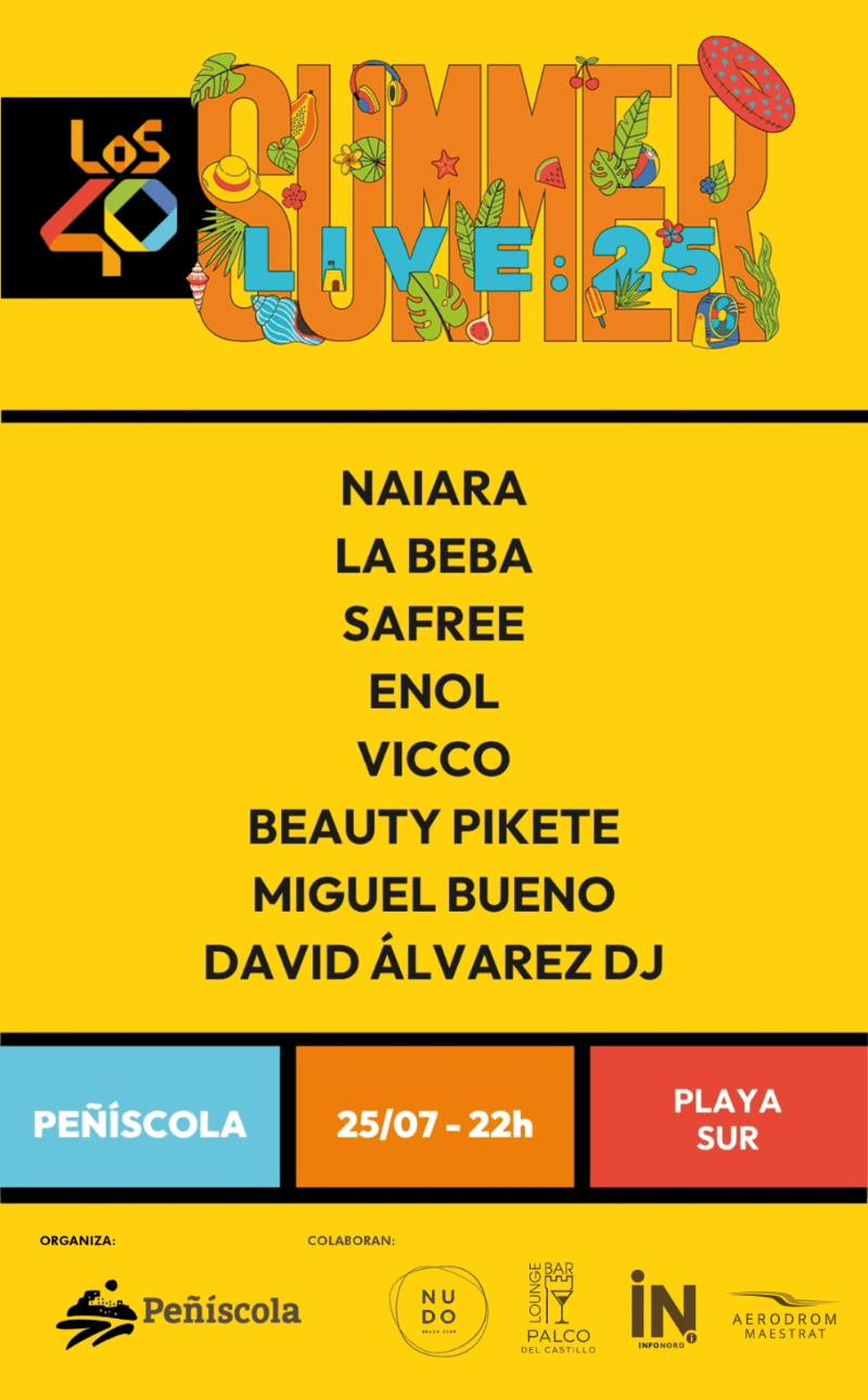 Según ha informado LOS40, el cartel confirmado para Peñíscola incluye artistas emergentes que están consolidándose en el panorama musical estatal, como Naiara, La Beba, Safree, Enol, Beauty Pikete, Vicco y Miguel Bueno, además de la sesión del DJ David Álvarez.