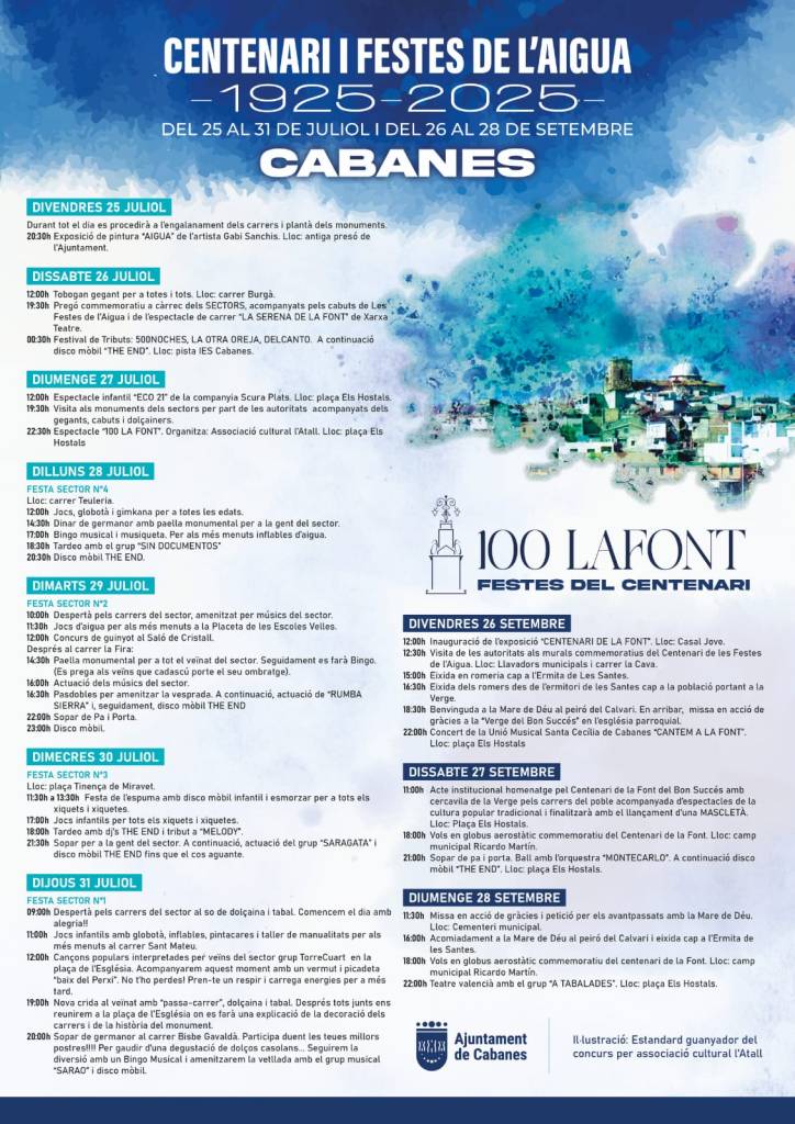 Las Fiestas del Agua de Cabanes se celebran el próximo fin de semana con una especial programación que conmemorará los 100 años de vida de la principal fuente de agua del pueblo. La Fuente del Buen Suceso se inauguró en septiembre del 1925 y, 100 años después, el pueblo recuerda este simbólico e importante hito en su historia moderna. Tal y como dicta la tradición instaurada en 1925, cada 25 años se celebran estos festejos con la principal singularidad de la decoración de todas las calles del municipio y la colaboración total y sincera del vecindario.