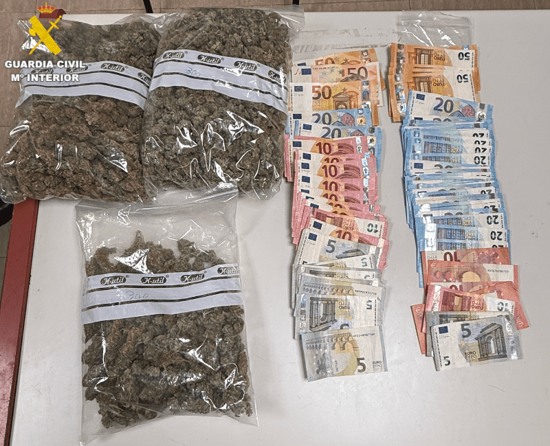 Al varón detenido se le ha incautado un total de 761,9 gramos de cogollos y el dinero que llevaba fraccionado en diversos fajos entre sus pertenencias.