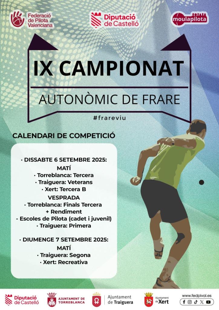 Torreblanca se convertirá de nuevo en epicentro de la pilota valenciana con la celebración, este fin de semana, del IX Campeonato Autonómico de Frare, una cita deportiva que regresa a la localidad por tercer año consecutivo tras el éxito de ediciones anteriores.
