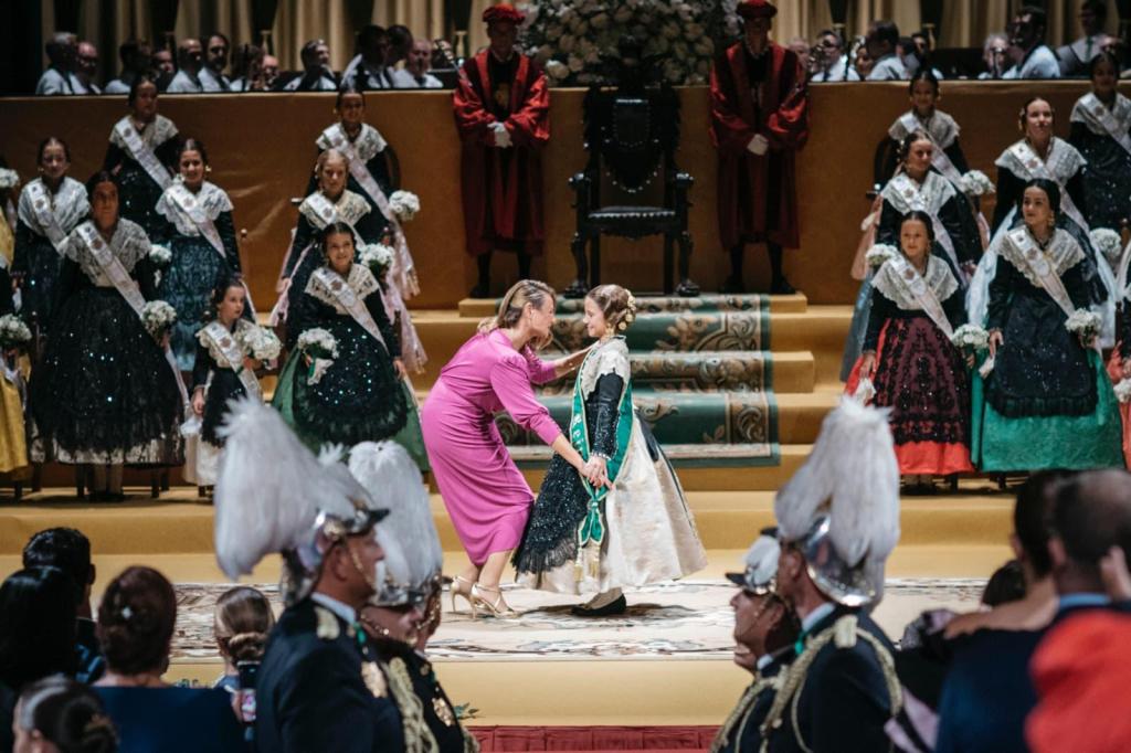La alcaldesa le ha impuesto la banda que la acredita como máxima representante infantil, y la Banda Municipal ha interpretado la Marxa de la Ciutat. Seguidamente, la primera edil le ha hecho entrega del pergamino y el ramo. Seguidamente, la alcaldesa ha regresado al palco presidencial y la Reina Infantil de las Fiestas ha ocupado el trono, desde donde ha escuchado las palabras que le ha dirigido el Presidente de Junta de Festes, Raúl Collados.
