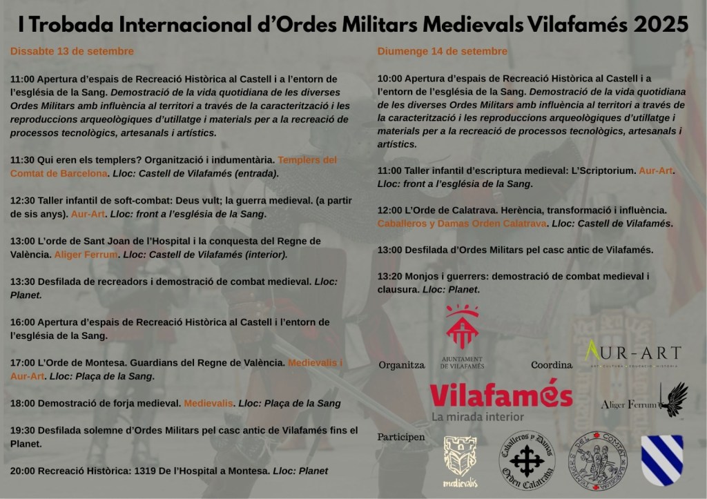 Durante dos días, el público podrá conocer de cerca el legado de los Templarios, Hospitalarios, la Orden de Montesa y la Orden de Calatrava, a través de demostraciones de vida cotidiana, rituales, armamento y escenas de campamento. Más de 30 recreadores históricos harán revivir las órdenes militares con rigor y pasión.