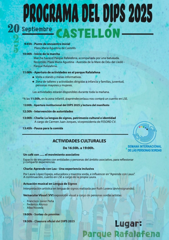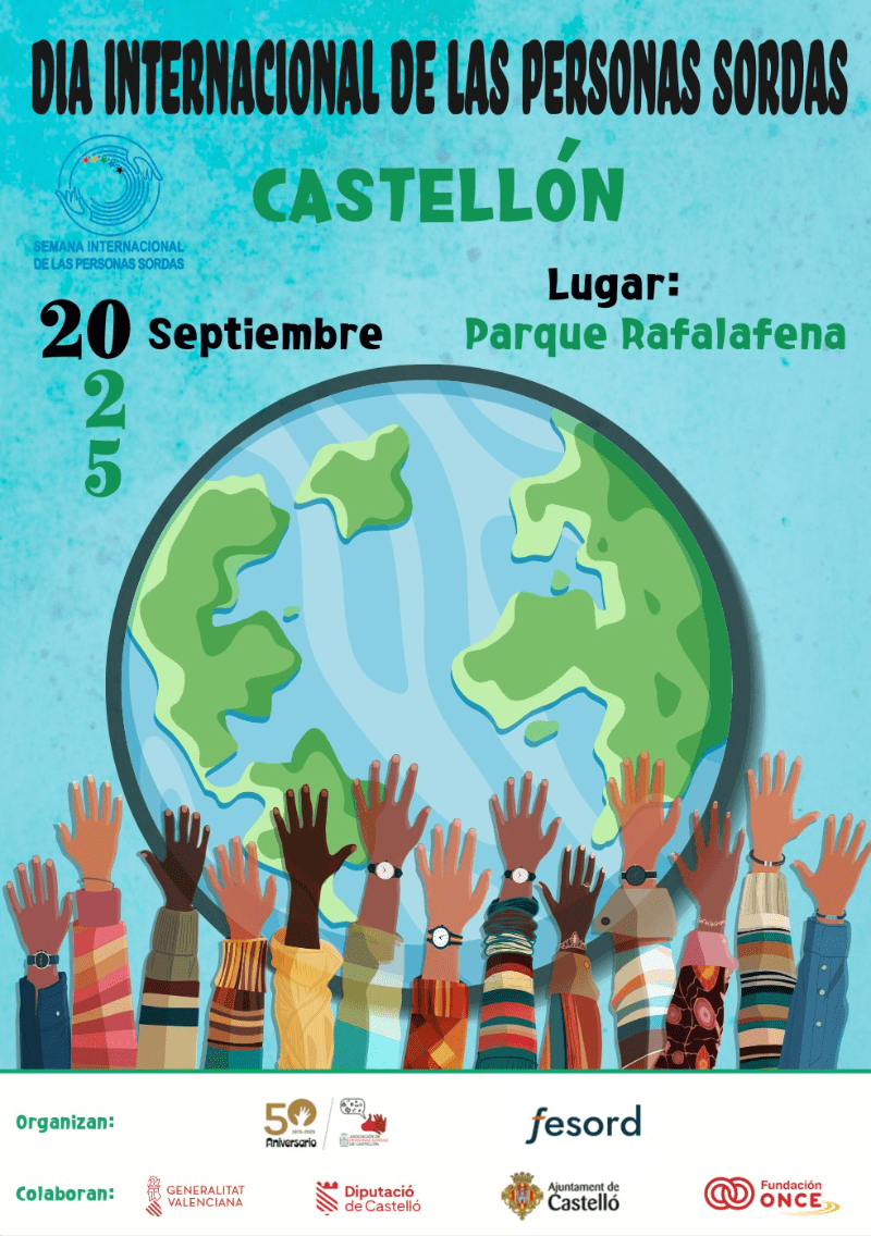 La Federación de Personas Sordas de la Comunitat Valenciana (FESORD CV) celebrará este sábado en Castellón el Día Internacional de las Personas Sordas (DIPS 2025), una jornada de convivencia, reivindicación y visibilidad organizada por APESOCAS con motivo de su 50 aniversario que contará con un amplio abanico de actividades para todas las edades.