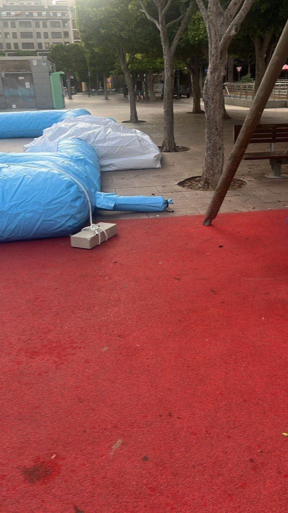 Según ha detallado la formación, el pliego de condiciones establecía que las atracciones debían estar correctamente ancladas con materiales homologados. Sin embargo, se utilizaron bloques de acera e incluso elementos del mobiliario urbano. El sábado ya se advirtió de esta situación y el domingo muchos hinchables directamente ni siquiera estaban sujetos.