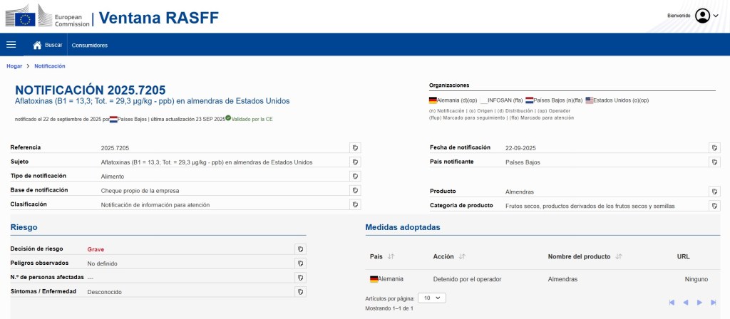 La red de alerta rápida de alimentos y piensos (RASFF) de la Comisión Europea notifica “un riesgo grave” en lotes de almendras procedentes de Estados Unidos por la detección de residuos de aflatoxinas que llegan a triplicar el nivel máximo permitido por la normativa. Según la notificación, los resultados analíticos de dichas importaciones de almendras constatan hasta 29,3 µg/kg de aflatoxinas, cuando el residuo máximo de esta micotoxina se establece en 10,0 µg/kg.