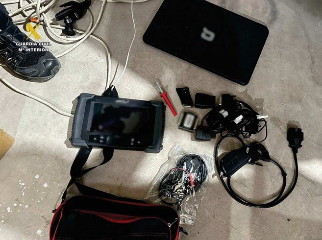 Asimismo, se intervinieron cuatro vehículos sustraídos en las provincias de Alicante, Castellón, Málaga y Valencia, junto con diverso material destinado a la manipulación de automóviles y falsificación de matrículas. Entre los efectos intervenidos destacaban un dispositivo de diagnóstico tipo OBD, empleado para la manipulación electrónica de los coches, ocho juegos de placas de matrícula que habían sido falsificadas, documentación de vehículos falsificada y chapas identificativas de bastidor falsas.