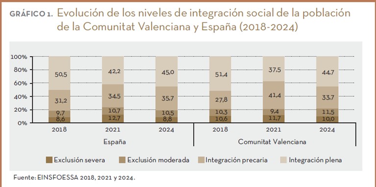 Cáritas Comunitat Valenciana (Segorbe-Castellón, Orihuela-Alicante y Valencia) ha alertado esta mañana, en la presentación del Informe FOESSA sobre Exclusión y Desarrollo Social en la Comunitat Valenciana 2025 de que una de cada cinco familias vive en exclusión social en la Comunitat, dato que apenas ha mejorado desde 2018. Dicho informe, que forma parte de un amplio trabajo en el ámbito estatal desarrollado por 140 investigadores de 51 universidades, centros de investigación, fundaciones y entidades del Tercer Sector, apunta, entre otras realidades, a que «quienes más sufrieron las consecuencias de la crisis financiera de 2007 y de la COVID siguen sin recuperarse y casi 20 años después de aquel crack económico, un importante sector de la población sigue sin ver aliviada su situación».