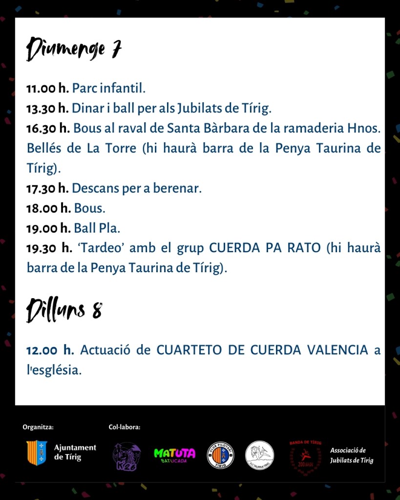 Organizadas por el Ayuntamiento de Tírig, las fiestas de Santa Bárbara cuentan con la colaboración de la Peña Taurina de Tírig, la Banda de Música, la Batukada Matuta, la Asociación de Jubilados y los Quintos 2026. El alcalde, Juanjo Carreres, ha agradecido a todas las entidades “su implicación y esfuerzo para mantener viva una tradición que es motivo de orgullo colectivo y punto de encuentro para todo el pueblo”.