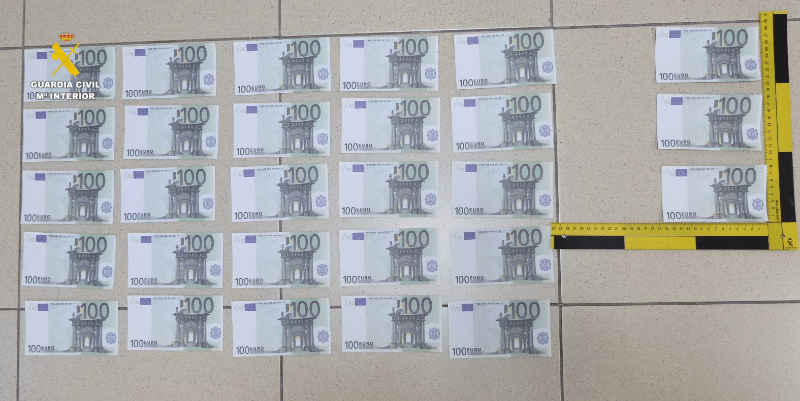 Las pesquisas se iniciaron el día 3 de enero tras tener conocimiento de que una mujer había intentado pagar con un billete de 100 euros aparentemente falso en un establecimiento comercial de la localidad. A su vez el día 5 del mismo mes, también se tuvo conocimiento de la posesión de otro billete de la misma cantidad por otra persona, practicándose diversas gestiones hasta lograr identificar y detener el pasado día 15 a un varón de 45 años, al cual le fueron aprehendidos 25 billetes de 100 euros falsos, llegando a ser localizados durante el transcurso de las gestiones un total de 30 billetes.