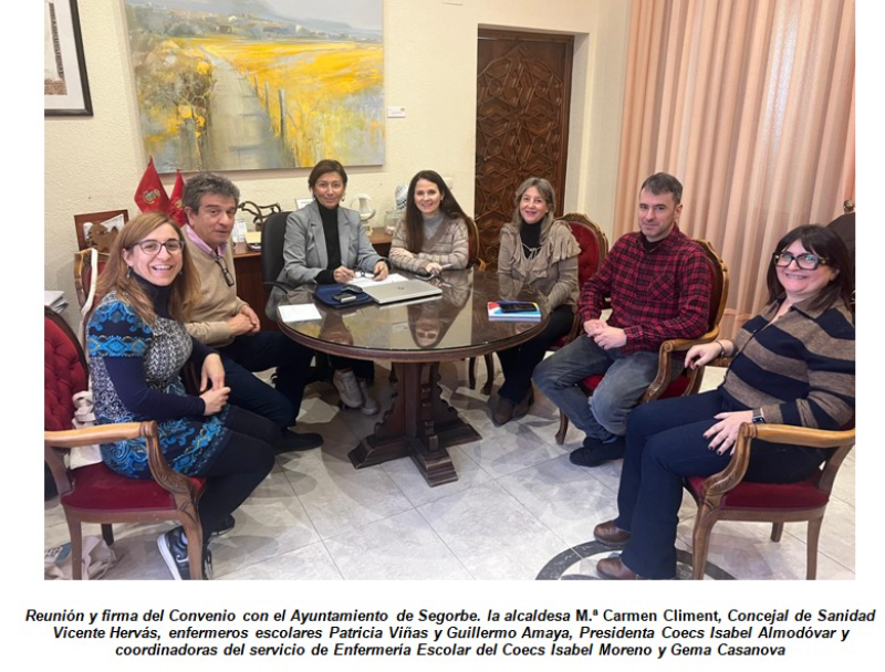 El acto de firma y renovación ha contado con la asistencia de una representación de ambas instituciones. Por parte del consistorio han participado la alcaldesa de Segorbe, M.ª Carmen Climent, y el concejal de Sanidad, Vicente Hervás. La delegación colegial ha estado encabezada por la presidenta del COECS, Isabel Almodóvar, junto a las coordinadoras del servicio de Enfermería Escolar, Isabel Moreno y Gema Casanova. Asimismo, han estado presentes los enfermeros escolares designados para el servicio: Patricia Viñas, desempeñando su labor en el municipio desde hace diez años y Guillermo Amaya, que continua en el equipo de salud escolar.