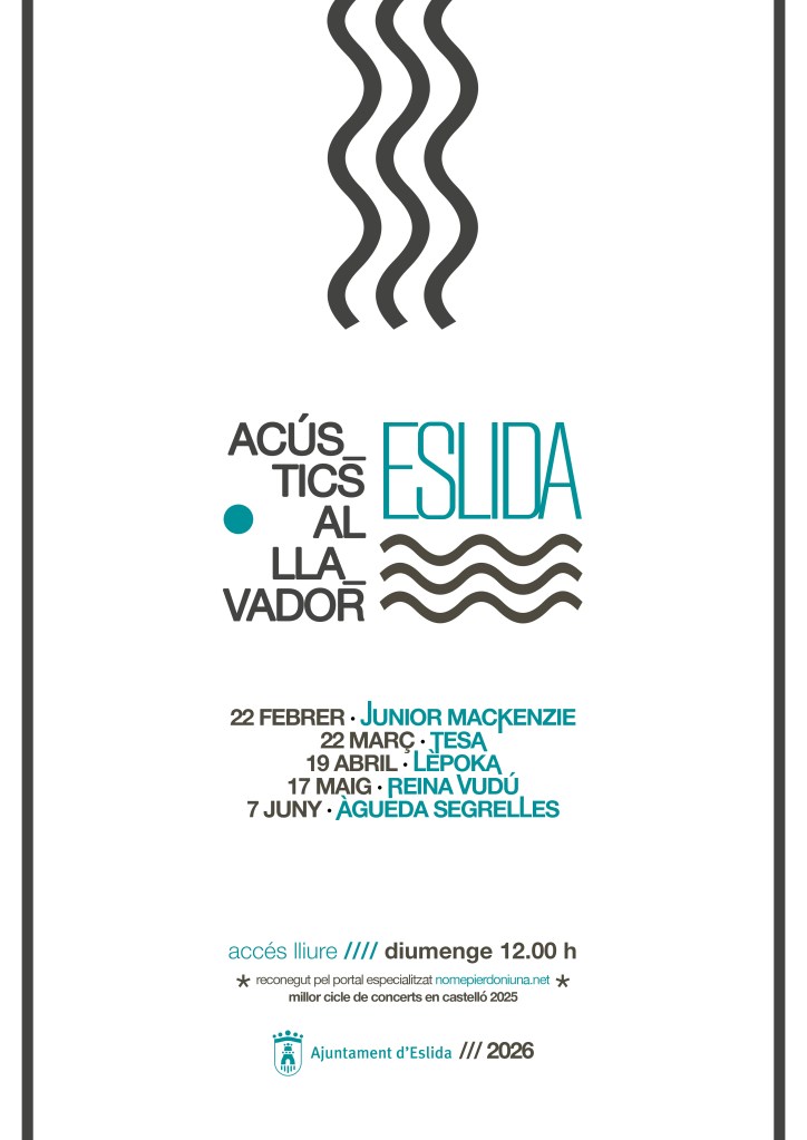 Por tercer año consecutivo, el Ayuntamiento de Eslida, a través de la concejalía de Cultura, encabezada por Rubén Carreguí, programa el singular ciclo de conciertos Acústics al Llavador. Cinco matinales de música en formato acústico y en un bello espacio como es este histórico lugar de encuentro vecinal ubicado en la calle Llavador. De nuevo, un cartel variado que reta a sus protagonistas a abandonar sus modos habituales de trasladar sus canciones al directo. El listado de grupos y solistas incluye en este 2026 a Junior Mackenzie (22 de febrero), Tesa (22 de marzo), Lèpoka (19 de abril), Reina Vudú (17 de mayo) y Àgueda Segrelles (7 de junio). Cada una de las actuaciones comenzará a las 12:00, siempre en domingo, con libre acceso.