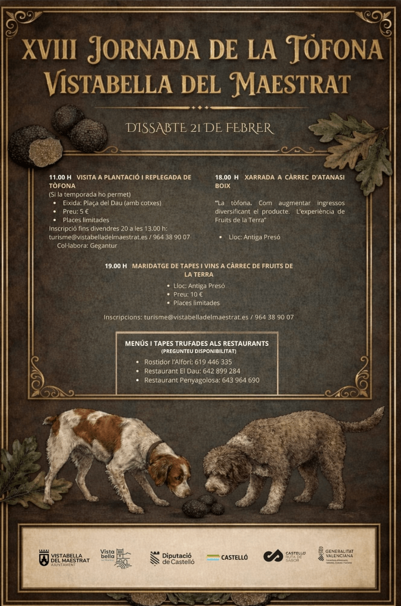 Por la tarde, la XVIII Jornada de la Trufa de Vistabella continuará en la Antiga Presó (18.00 h), con una charla técnica a cargo de Atanasi Boix, propietario de Fruits de la Terra, centrada en estrategias para aumentar la rentabilidad mediante la diversificación y el valor añadido, a partir de la experiencia propia. La charla continuará con un maridaje de tapas y vinos a cargo de Fruits de la Terra. La parte gastronómica se completa con la participación de restaurantes locales -Asador El Alforí, restaurando El Dau y restaurante Penyagolosa- que ofrecerán menús y elaboraciones con trufa.