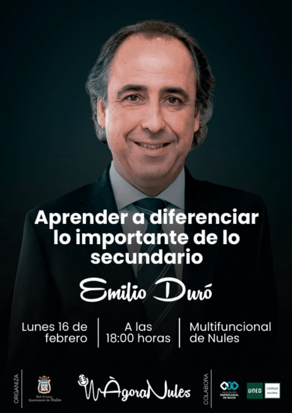 “Aprender a diferenciar lo importante de lo secundario”, es la conferencia que impartirá Emilio Duró el lunes, 16 de febrero, a las 18 horas en el Local Multifuncional de Nules con entrada gratuita hasta completar el aforo.