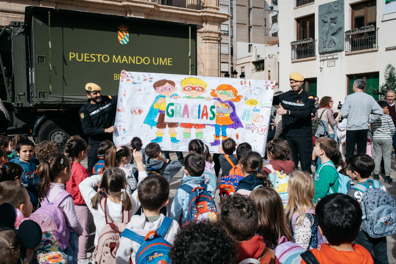 La plaza Mayor ha acogido una completa exposición de vehículos que ha permitido a los ciudadanos acercarse al material y medios que la UME emplea en situaciones de emergencia, como la DANA o la reciente borrasca que afectó a Andalucía. Los centenares de escolares asistentes han podido contemplar un camión de Puesto de Mando, un camión autobomba en configuración invernal, un vehículo terrestre, una máquina empujadora, un vehículo táctico todoterreno, dos motocicletas de Policía Militar, una ambulancia de soporte vital y un remolque con embarcación.