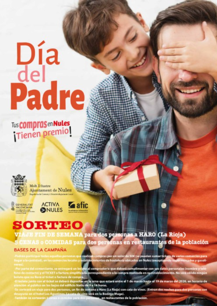 Nules lanza una nueva campaña de promoción del comercio local, en esta ocasión con motivo del Día del Padre, con la que da continuidad al lema “Tus compras en Nules. ¡Tienen premio!”.