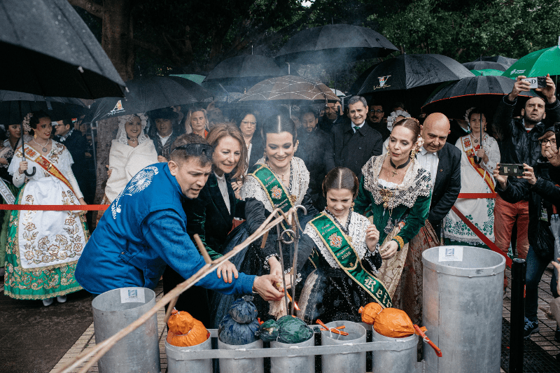 Tras el acto protocolario de la recepción a las diferentes delegaciones y la entrega de los Fadrins Honorífics, la comitiva oficial se ha dirigido hacia el recinto de mascletaes, en la calle María Rosa Molas, junto al Primer Molí, donde se han congregado miles de castellonenses, a pesar de la lluvia que ha estado presente.