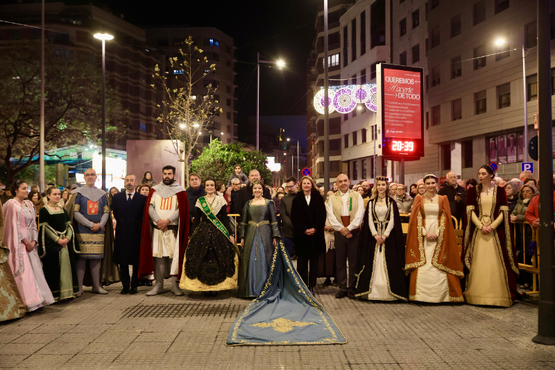 A las 19:30 horas, desde la figura del rey Jaime I, la comitiva de la Germandat dels Cavallers de la Conquesta, junto a Na Violant, ha desfilado por las calles de Castellón hasta la plaza que lleva el nombre de la esposa del monarca.