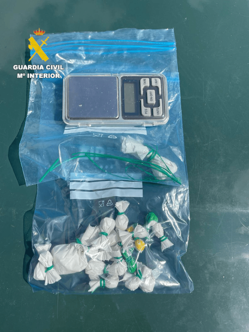 Tras realizar las comprobaciones oportunas y efectuar un registro del vehículo, los agentes localizaron en su interior 26,64 gramos de cocaína distribuidos en varias bolsas, así como una báscula de precisión, elementos que apuntan a un posible tráfico de sustancias estupefacientes.
