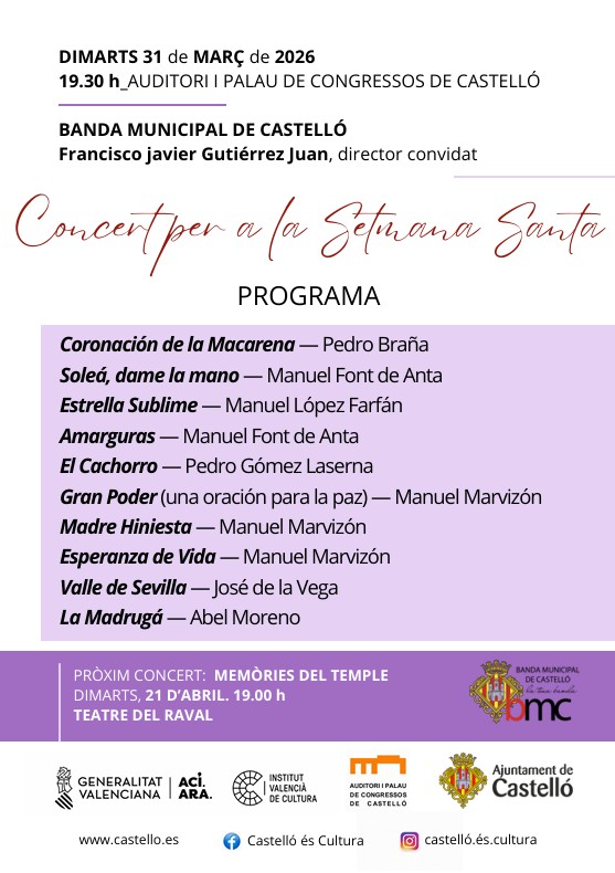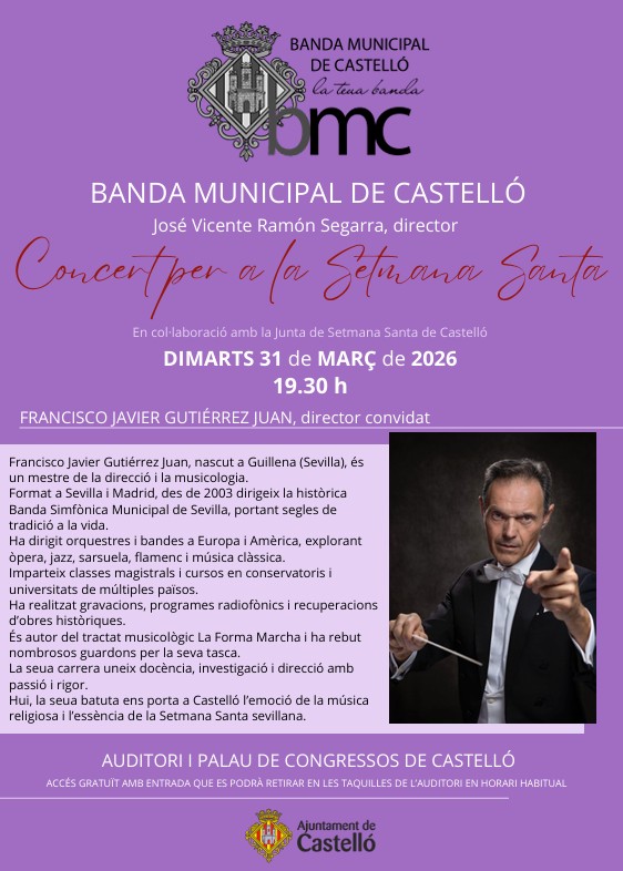 La Banda Municipal de Castellón, bajo la dirección de José Vicente Ramón Segarra, ha preparado otro excepcional concierto con motivo de la Semana Santa.