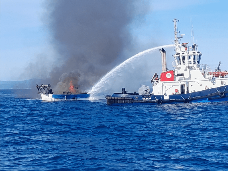 Uno de los pescadores ha sido atendido por los servicios sanitarios debido a la intoxicación provocada por el humo, dado que en el momento del rescate el barco continuaba en llamas.