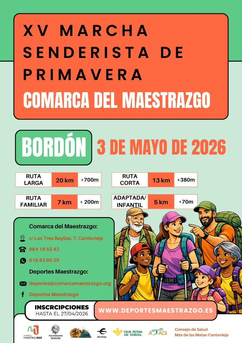 Las inscripciones estarán abiertas hasta el 27 de abril de 2026 a través de la página web oficial: www.deportesmaestrazgo.es. o del siguiente enlace: https://www.avaibooksports.com/inscripcion/xv-senderista-primavera-bordon-2026/inscripcion_datos/