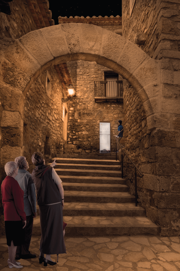 El itinerario comenzará en la Fuente medieval del carrer de la Font y recorrerá distintos puntos clave del municipio, conectando los accesos históricos a la muralla y al castillo a través de un sistema de iluminación respetuoso, reversible y plenamente integrado en el entorno patrimonial.