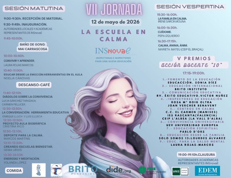 La séptima edición de esta jornada tomará este año las instalaciones de la Escuela de Empresarios de Valencia (EDEM). Quien desee asistir al evento puede reservar su plaza en la web https://www.insnovae.es/jornada-la-escuela-en-calma y formar parte de una sesión a la que están llamados alumnos, docentes e inspectores. “Toda la comunidad educativa en general, porque esta sesión pretende ser una amplia reflexión sobre el presente educativo que nos ocupa para definir qué futuro deseamos emprender”.
