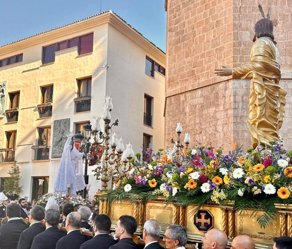 Ambas procesiones se han unido en el “Encuentro” a los pies de la torre campanario de El Fadrí, tras el que se ha disparado un remate pirotécnico y lanzamiento de confeti. Se ha procedido también al tradicional volteo de campanas, contando asimismo con el acompañamiento musical de la Banda Municipal de Castellón, que ha interpretado el Himno Nacional de España.