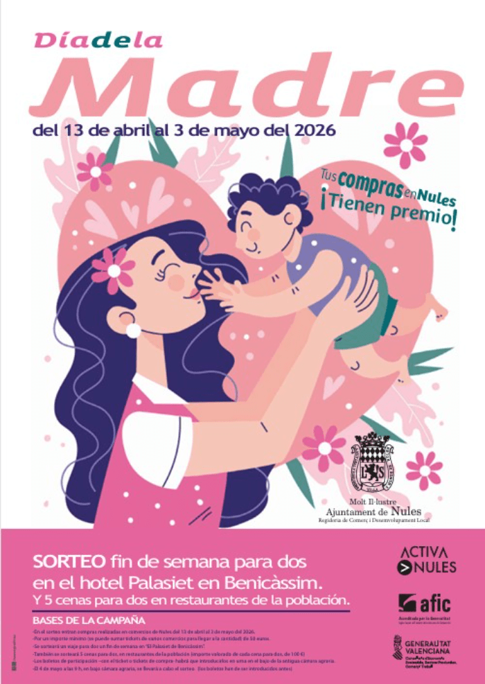 Nules lanza una nueva campaña de promoción del comercio local con motivo del Día de la Madre, que se celebra el primer domingo del mes de mayo, y da continuidad de nuevo al lema “Tus compras en Nules. ¡Tienen premio!”.