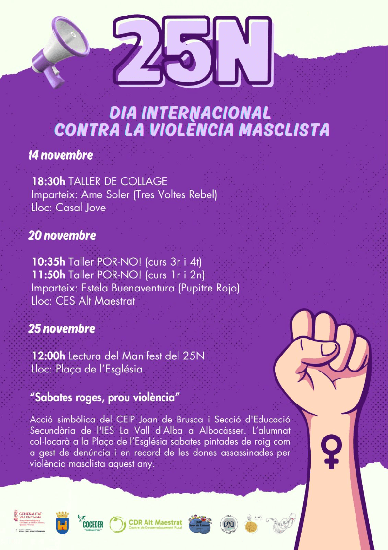 Albocàsser ha preparado un programa de actividades con motivo del 25 de noviembre, Día Internacional para la Eliminación de la Violencia contra las Mujeres, fruto del trabajo conjunto de diversas entidades y centros del municipio.