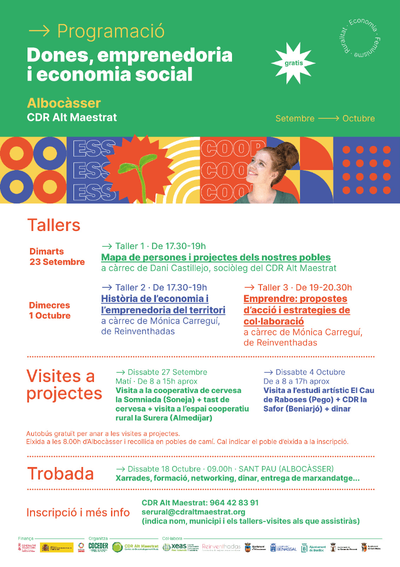 El CDR El Maestrat, con sede en Albocàsser, ha organizado para septiembre y octubre una serie de charlas y talleres que, bajo el título «Mujeres, emprendimiento y economía social”, quieren incentivar el emprendimiento de las mujeres en el interior e impulsar proyectos vinculados a la economía social y solidaria.
