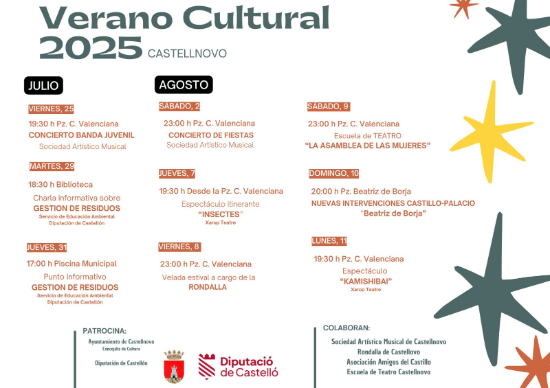 El Ayuntamiento de Castellnovo, a través de la Concejalía de Cultura, ha presentado la programación del Verano Cultural 2025, la agenda de actividades que se desarrollará entre finales de julio y la primera quincena de agosto, con propuestas para todas las edades y gustos.