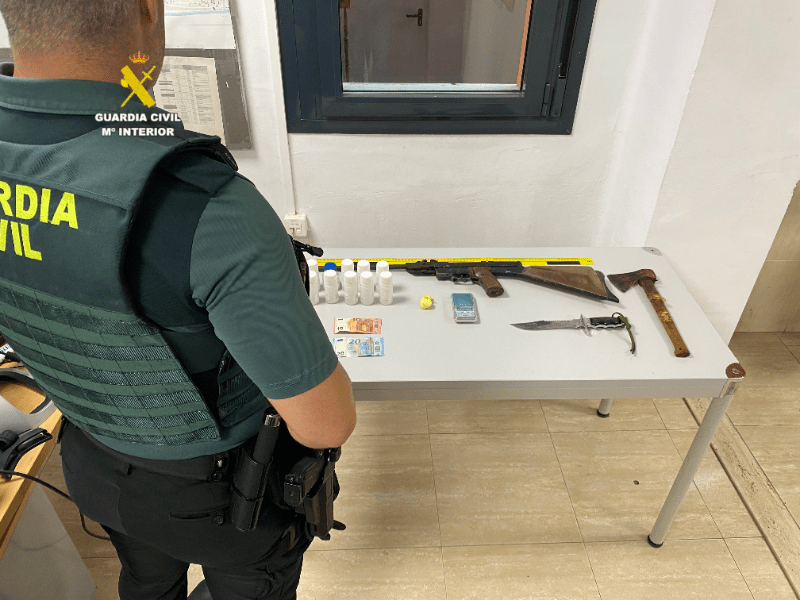 Se han intervenido, 10 gramos de cocaína, 12 botes de metadona, una báscula, un machete militar, un hacha, una carabina de aire comprimido, bolsas de plástico recortadas y 30 euros en metálico