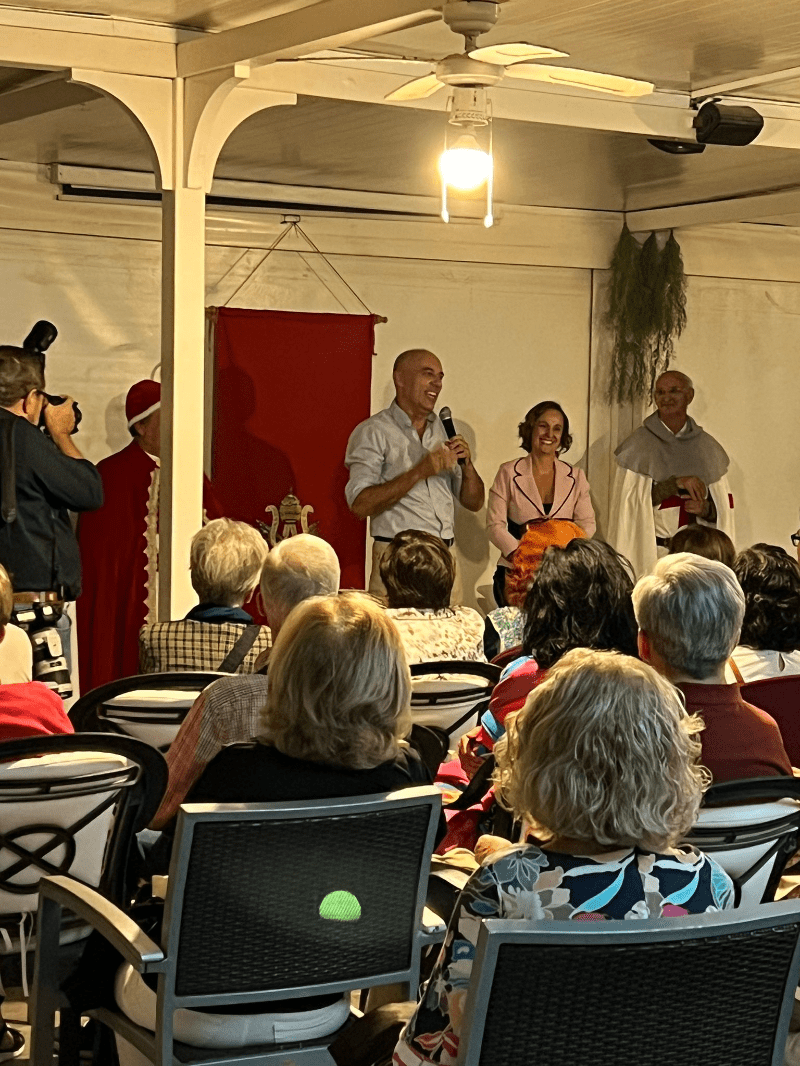 El escritor desbordó la terraza del Casino Antiguo junto al ex presidente de la Diputación, Pepe Martí, que se metió en el papel del Papa Luna