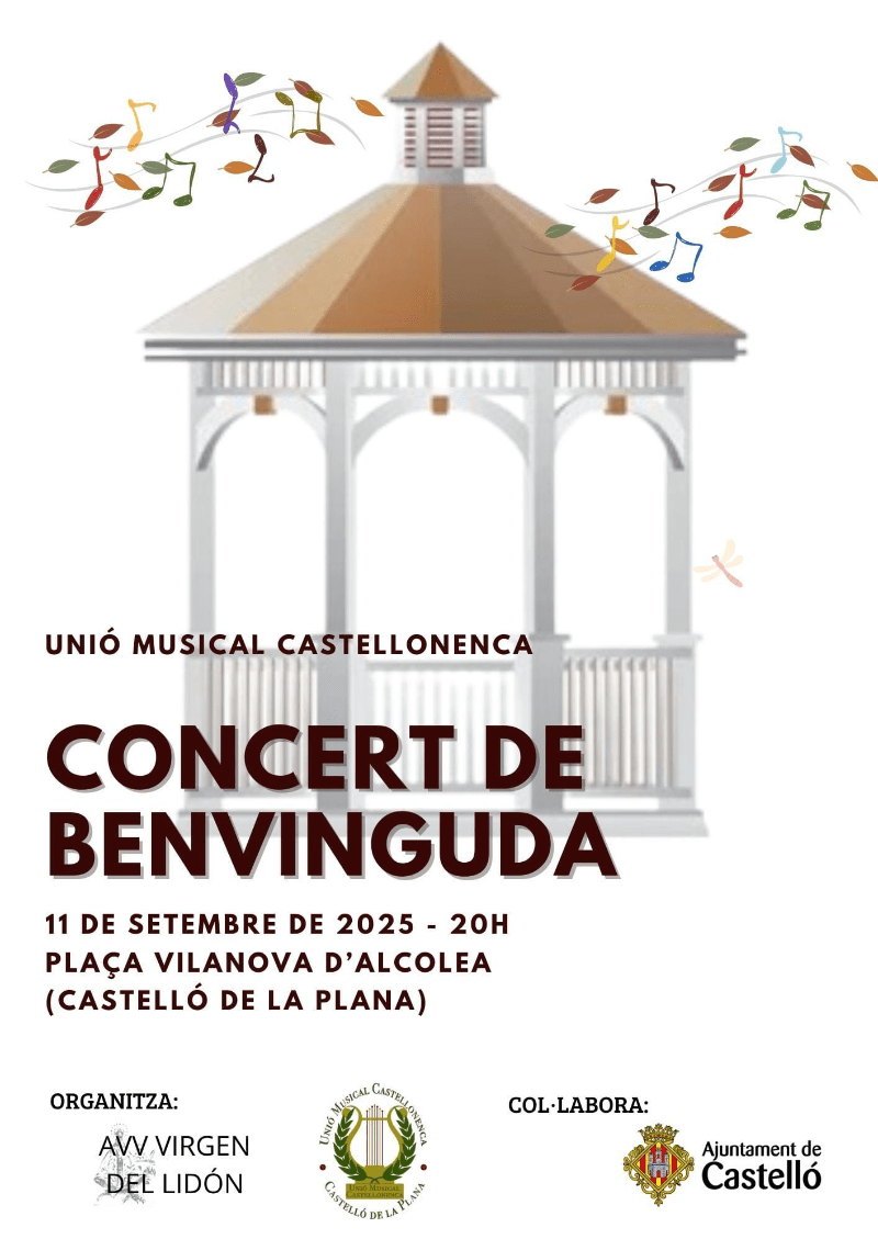 La Asociación de Vecinos Virgen del Lidón anuncia la celebración de un Concierto de Bienvenida, organizado en colaboración con la Unió Musical Castellonenca, que tendrá lugar el jueves 11 de septiembre , a las 20:00 horas, en la Plaza Vilanova d’Alcolea de Castelló de la Plana.
